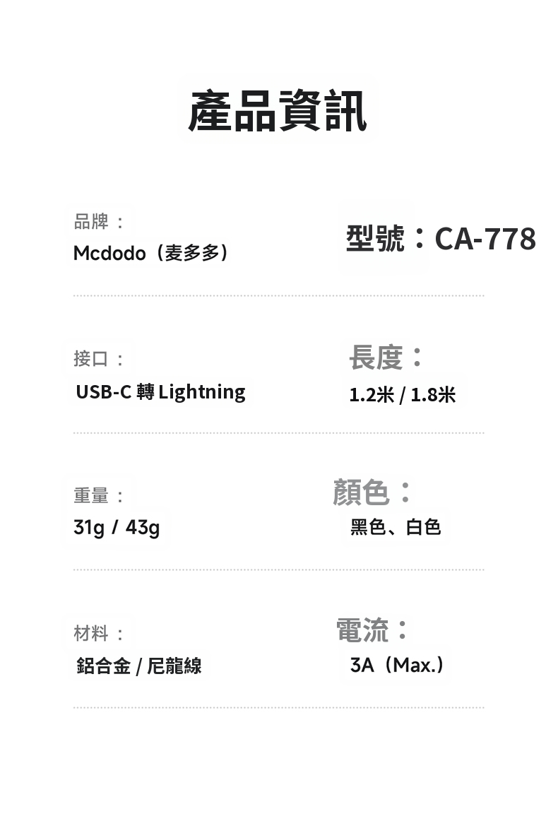 CabLuma系列 C TO L 36W 高速充電數據線 180公分 數量